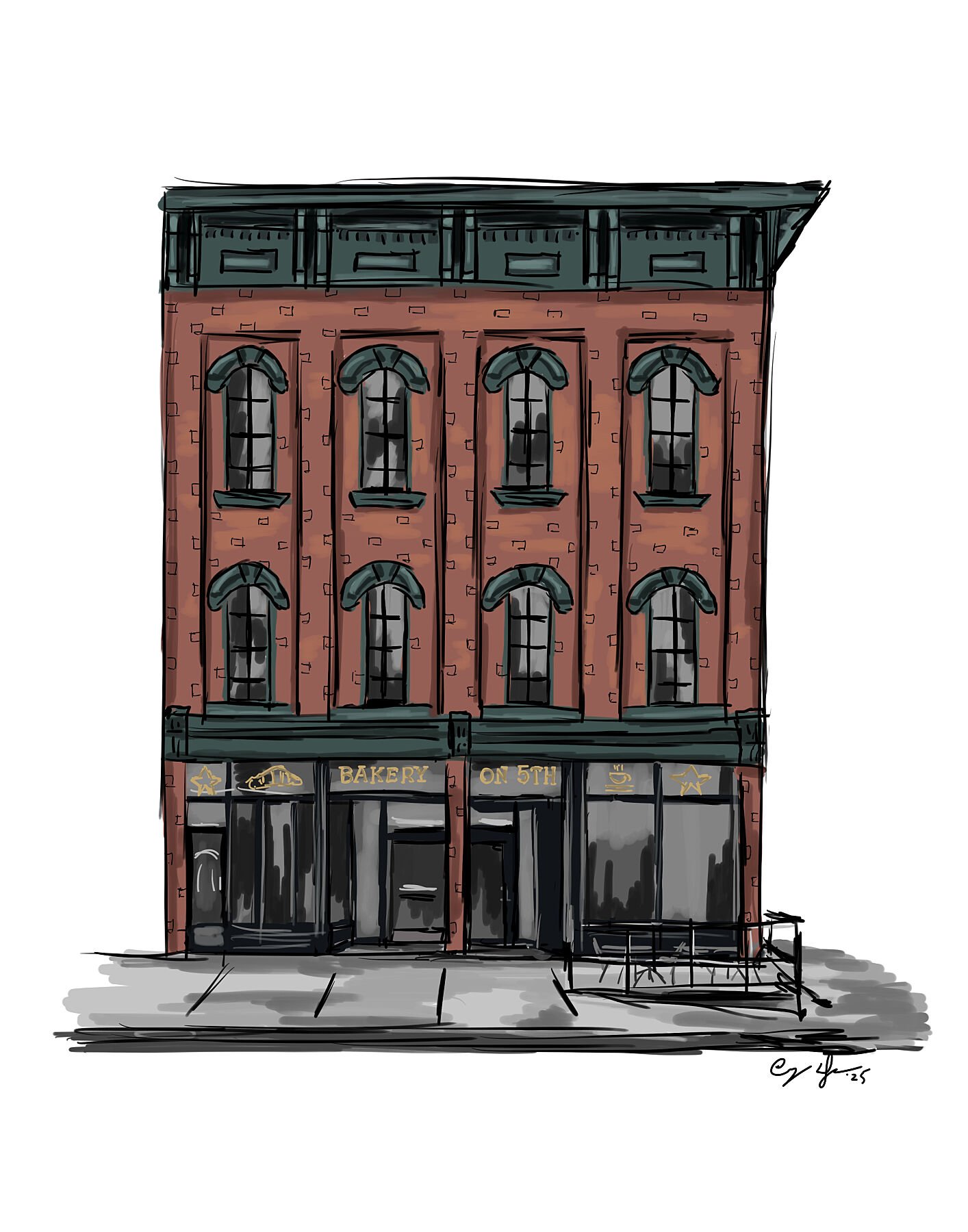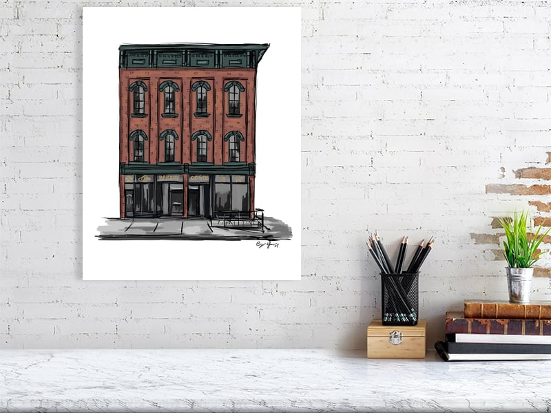 Urban Sketch of the Bakery on 5th in Downtown Erie.
